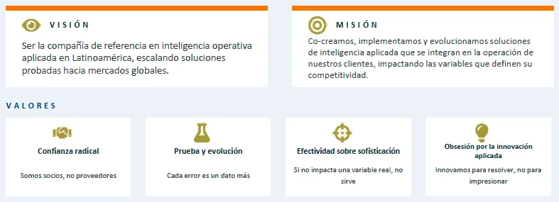 La empresa proporciona soluciones de inteligencia operativa aplicada mediante un sistema tecnológico avanzado que se integra con las operaciones de cada cliente, permitiendo convertir datos en ventajas competitivas medibles.